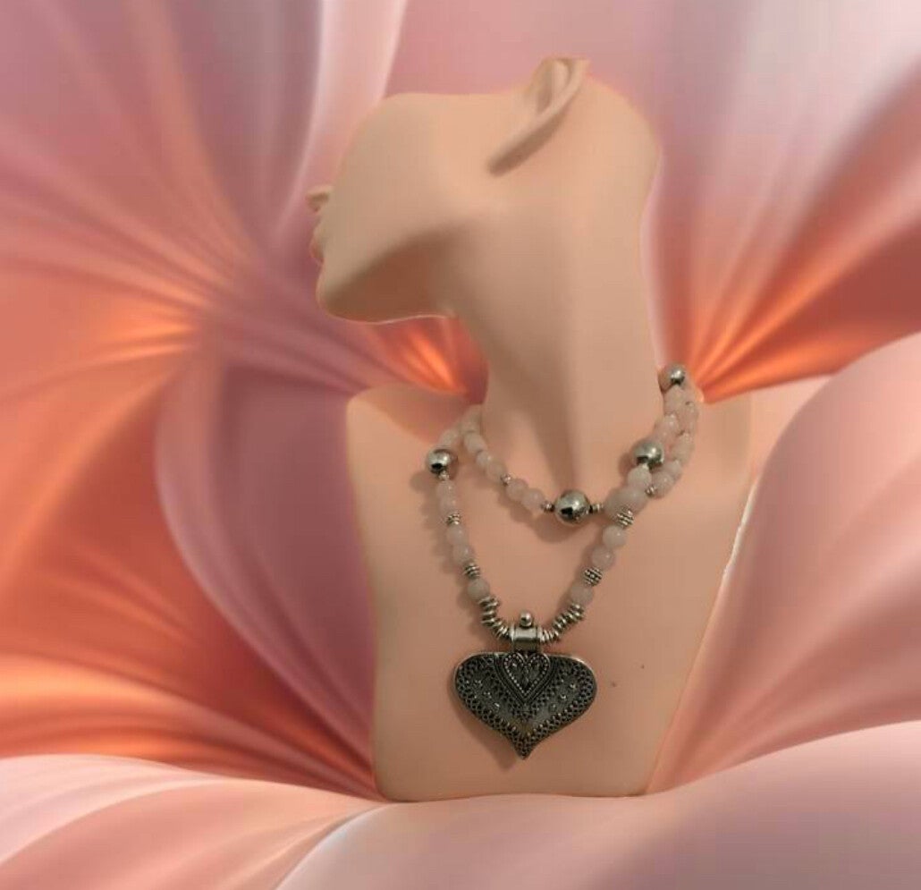 Luscious 8mm Rose Quartz natural beads with large silver bead accents and a very detailed heart pendant. Stretch necklace, slips on, overall length is 27". Pendant is an additional 2 inches. Definitely a statement piece for the stone known for love!