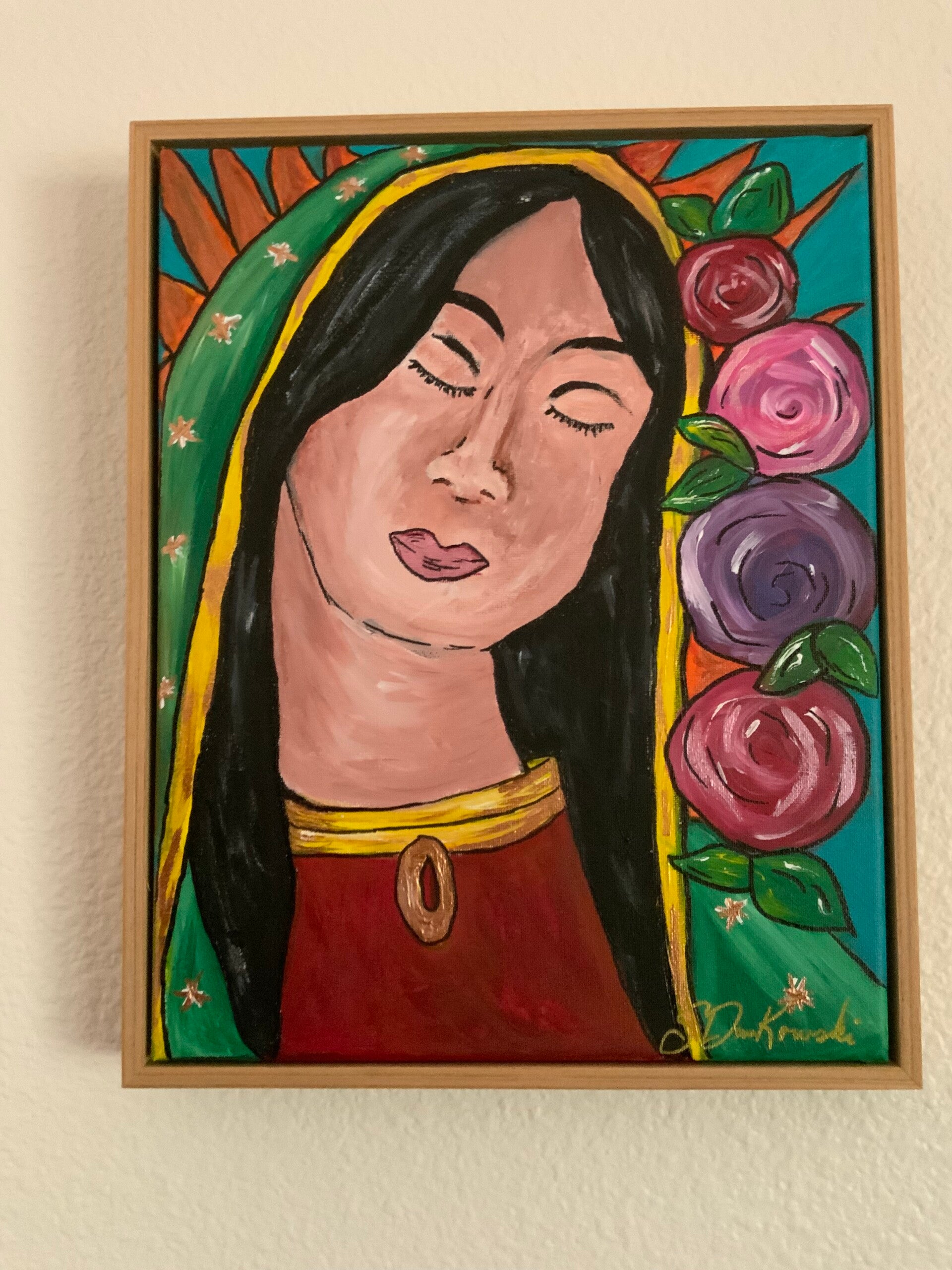 A folk art impression of Our Lady of Guadalupe. Acrylic 11x14 on a stretched canvas mounted in a simple floating frame.