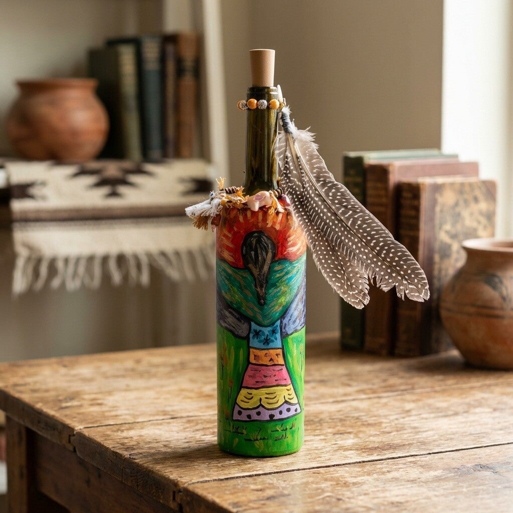 Wine bottle that has been painted with acrylics and metallics. Indian Angel lifts her arms in prayer before an exploding sunset. Bottle is filled with white lights and has replaceable batteries in a faux cork top. Expressing hope in tomorrow. One of a kind.