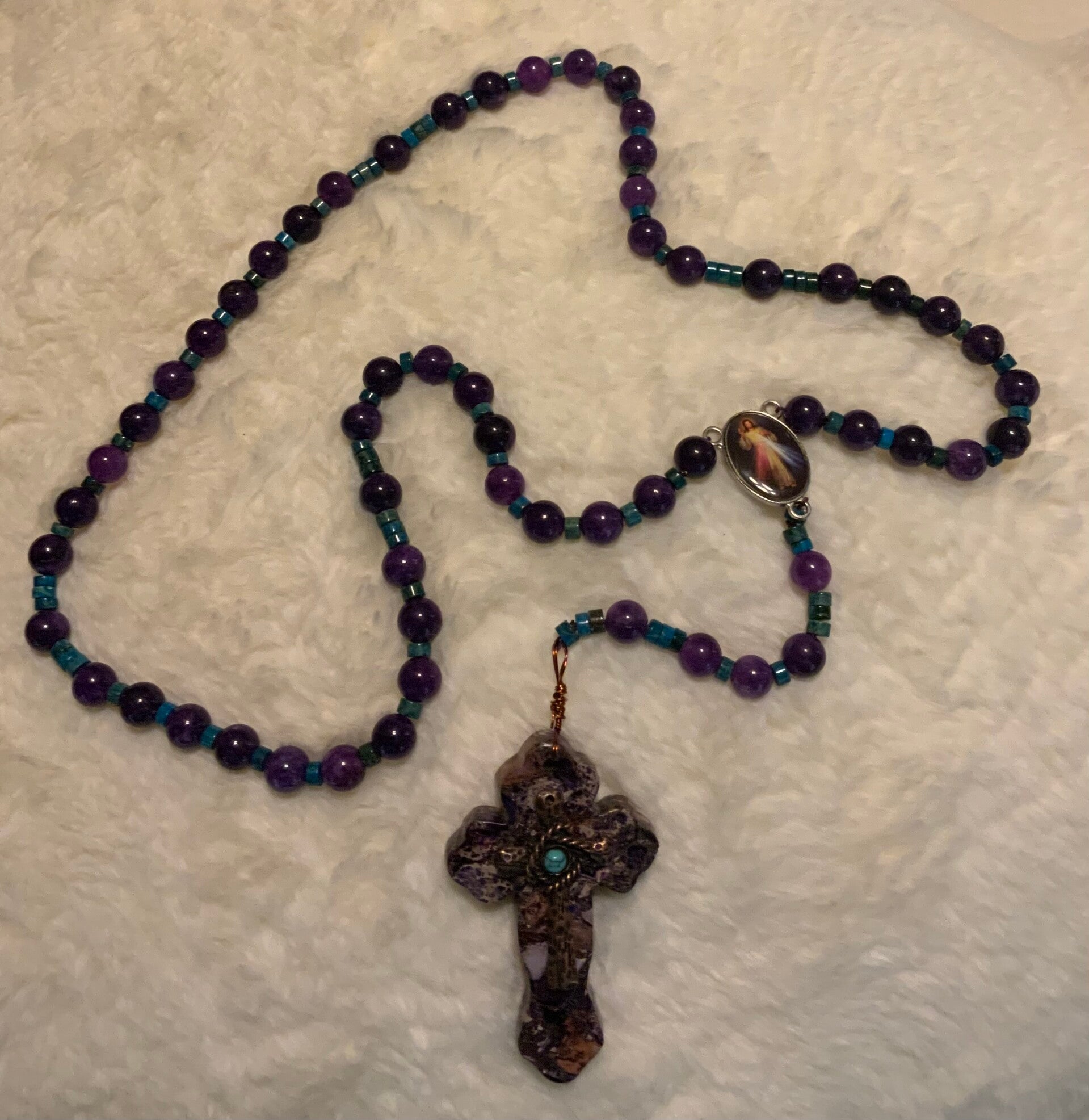 This bohemian rustic set of Catholic prayer beads has a wonderful feel in your hands weight wise and smoothness of the stones. The chunky style crushed cross is encrusted with a smaller copper one that has a round turquoise bead. The beads are 8mm natural amethyst and the small circular spacers are natural turquoise. Truly a one of a kind heirloom piece.