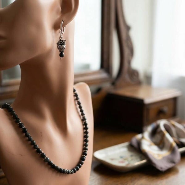 Smoky silver grey natural Larvakite 6mm beads with silver tone accents and clasp closures on this 23 inch necklace. The matching earrings are clip hoops with both dangling beads and a silver heart. It is a set that exudes a classic casual style.