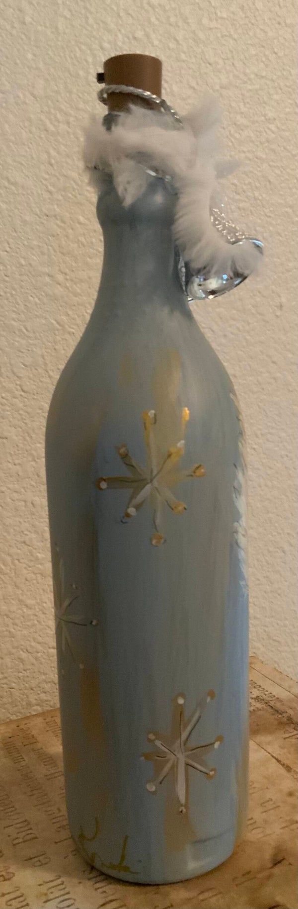This lovely golden angel spreads wishes of love. It is an acrylic painted wine bottle filled with white fairy lights. The replaceable batteries are located in the top faux cork. A soft fluffy yarn and silvery bell add charm to the top. Wonderful home accent piece or nightlight. Original work, only one.